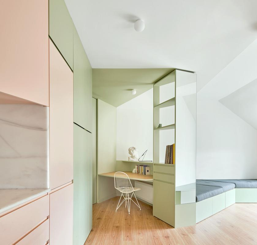 清新的綠轉(zhuǎn)為優(yōu)雅的粉,就到了開放式廚房,界限感十分柔和。